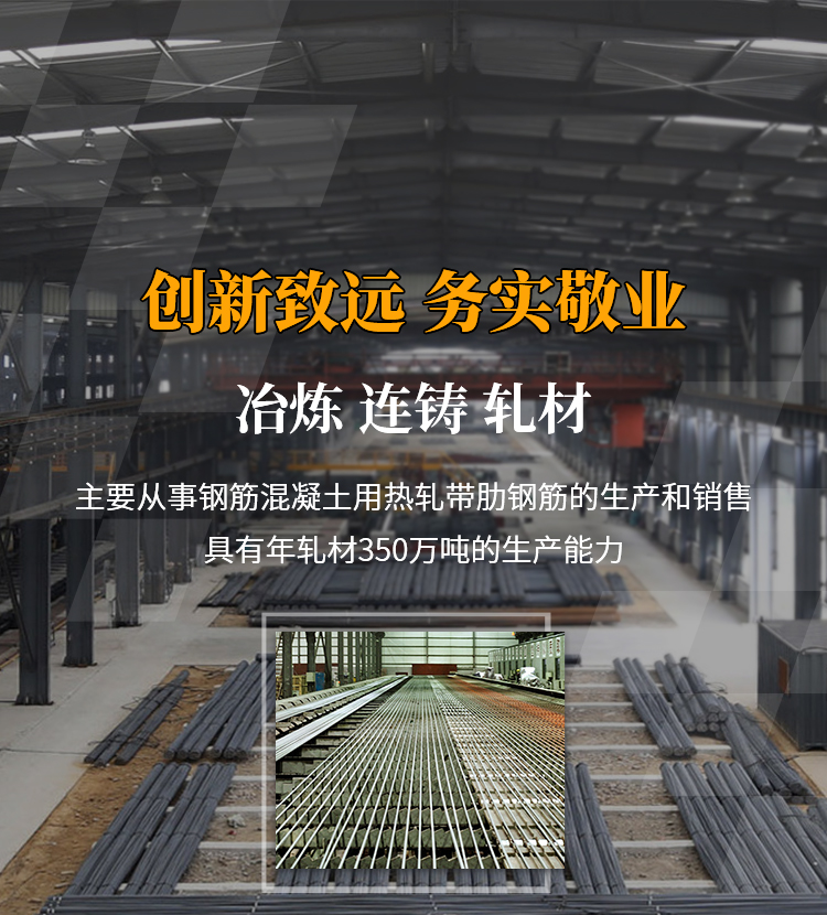 生产HRB335、HRB400,Φ10―Φ25规格钢筋混凝土用热轧带肋钢筋,具有年产钢200万吨、轧材 200万吨的生产能力。是一个具有冶炼、连铸、轧材等综合性生产能力的中型钢铁企业,“鹤塔”牌钢筋畅销长三角地区。